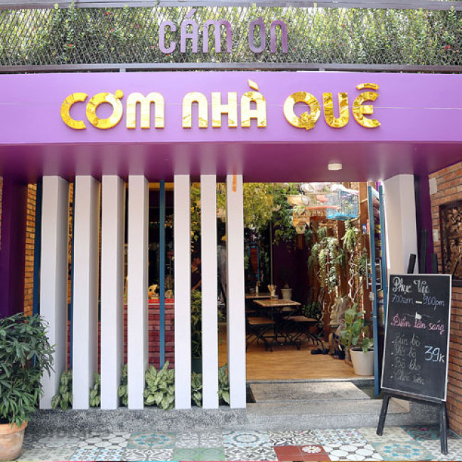 Tọa lạc ở con hẻm nhỏ trên đường Xô Viết Nghệ Tĩnh, quận 1, Cơm Nhà Quê tách biệt hẳn với sự ồn ã của phố thị, đưa thực khách đến một không gian rất đỗi bình yên. Không phải không gian có mái lá, bờ ao mát rượi nhưng với sắc tím ngọt ngào, Cơm Nhà Quê đã đủ khiến thực khách cảm thấy thư thái. Đến Cơm Nhà Quê, bạn không chỉ tìm được một chỗ ngồi lý tưởng ấm cúng và thoải mái để thưởng thức cơm nhà thơm ngon, mà còn được chiêm ngưỡng những kỉ vật vô giá của chủ nhân quán. Những chiếc bình gốm, quạt điện, máy phát nhạc, điện thoại… chỉ cần nhìn đã có thể đoán được tuổi đời của nó, tất cả nhuốm màu thời gian càng làm cho Cơm Nhà Quê trở nên thân thương.