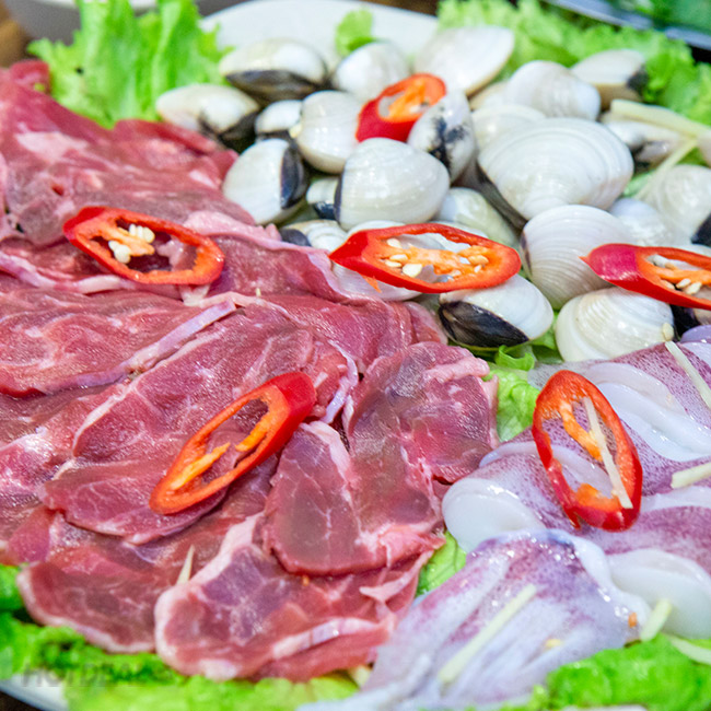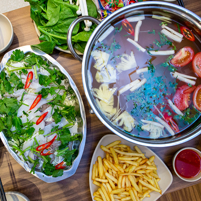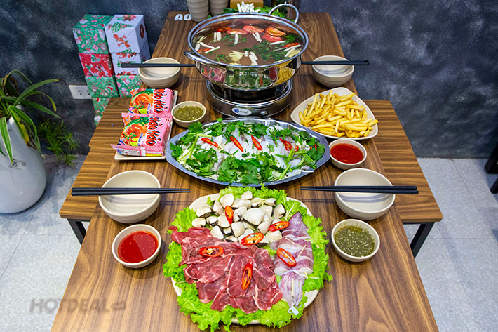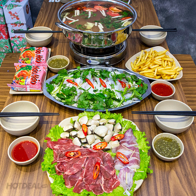 * Chi tiết set - Khoai tây chiên - Mực lá hấp chanh 200gr - Lẩu hải sản + Ngao trắng 300gr + Mực ống 100gr + Bắp bò 150gr + Rau kèm lẩu, nấm, mỳ ăn kèm