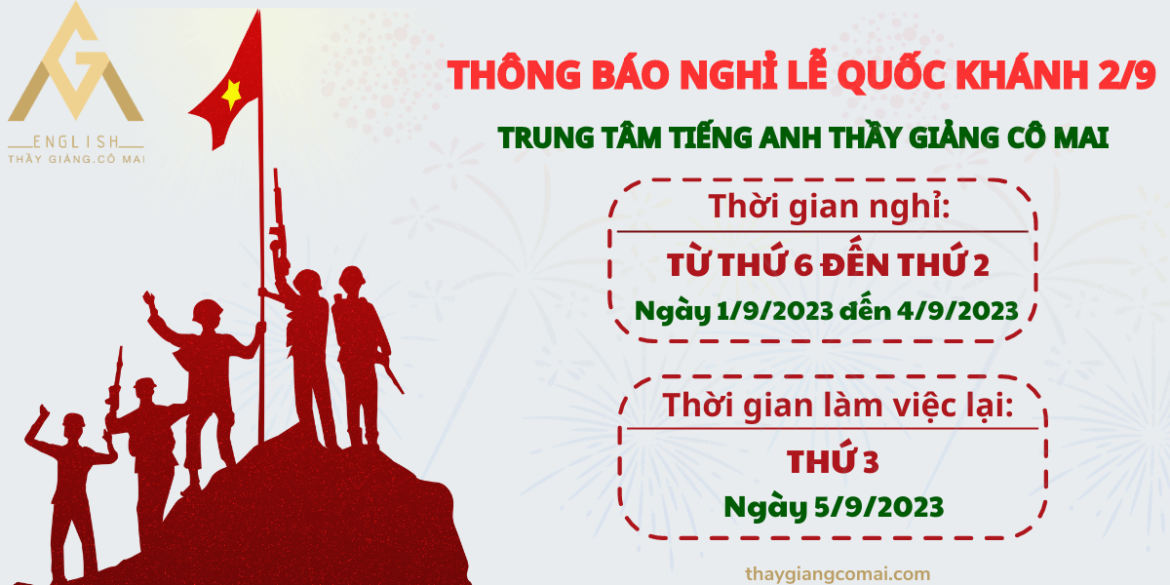 được viết bởi Thầy Giảng - Cô Mai 23/08/2021Tiếng Anh Thầy Giảng Cô Mai gửi đến các bạn thời gian nghỉ lễ Quốc Khánh sắp tới như sau: