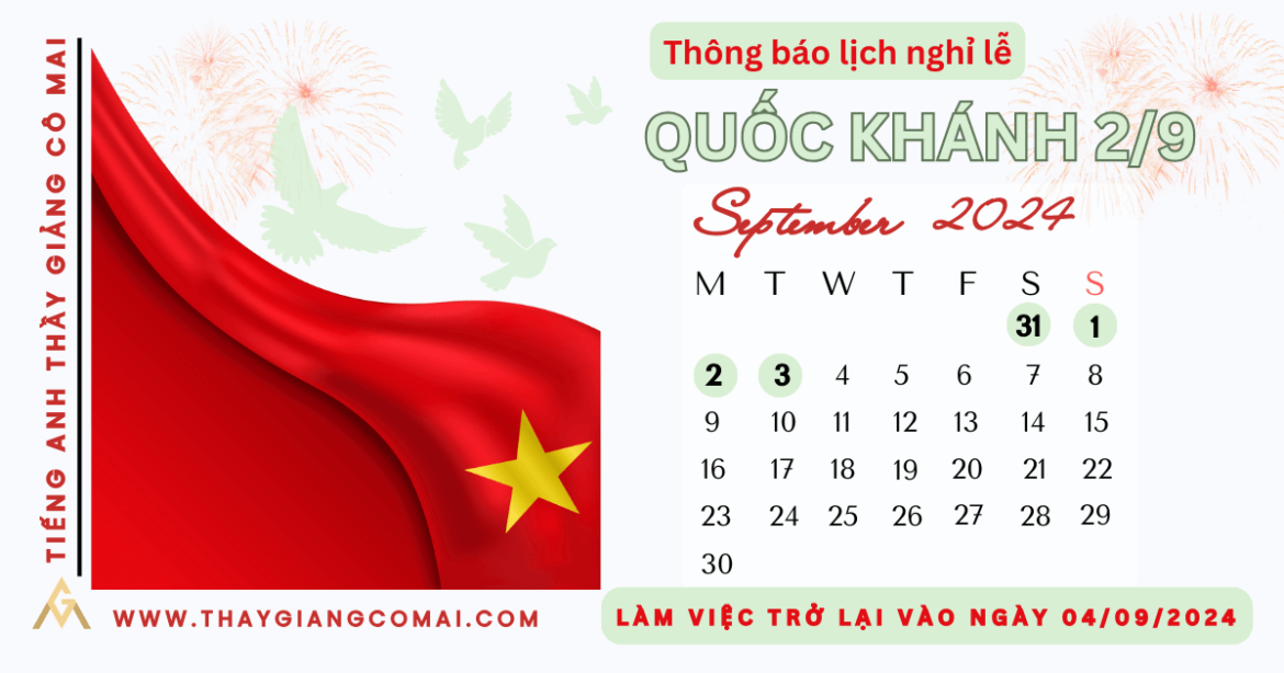 được viết bởi Thầy Giảng - Cô Mai 13/08/2024Các bạn học viên thân mến, – Chỉ còn chưa đầy 1 tháng nữa là đến kỳ nghỉ lễ 2/9 rồi, các bạn hẳn là đang háo hức và mong chờ lắm phải không? – Trung tâm gửi đến các bạn thời gian nghỉ lễ Quốc Khánh 2/9 năm nay để các bạn lên kế hoạch cho kỳ nghỉ lễ sắp tới nhé: