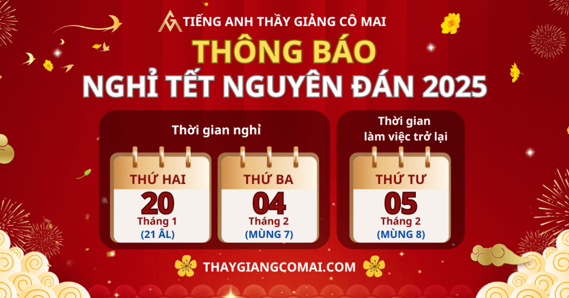 Chỉ còn khoảng chưa đầy 2 tháng nữa là Tết đến rồi. Tiếng Anh Thầy Giảng Cô Mai gửi các bạn lịch nghỉ Tết Nguyên Đán 2025 chính thức để các bạn học viên chủ động sắp xếp thời gian và quay trở lại việc học sau Tết nhé.