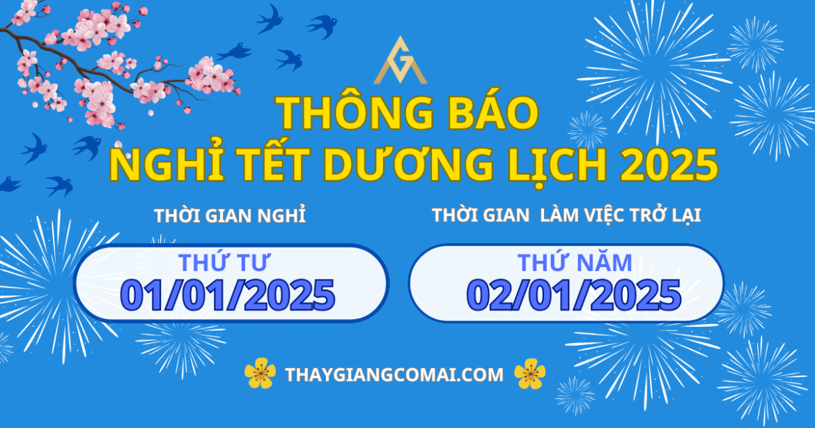 Tiếng Anh Thầy Giảng Cô Mai gửi đến các bạn thời gian nghỉ Tết Dương Lịch năm 2025 chính thức của Trung tâm để các bạn chủ động sắp xếp kế hoạch cá nhân của mình nhé.