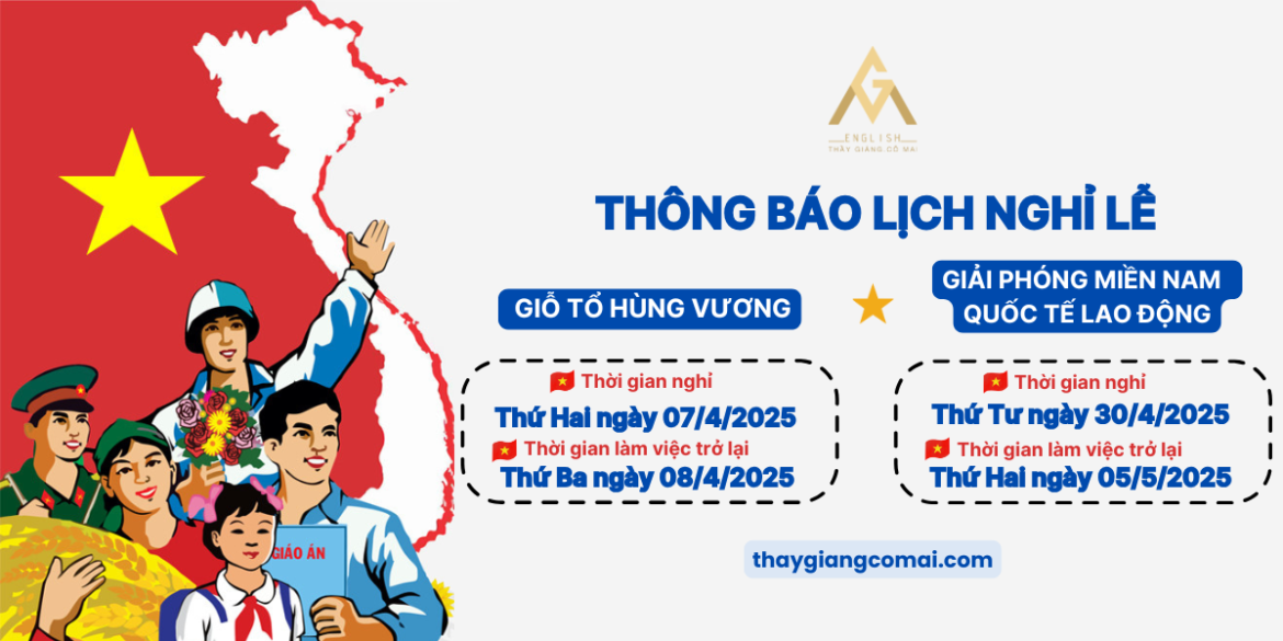 Trong tháng 4 và đầu tháng 5 năm 2025 này, chúng ta có các đợt nghỉ lễ Giỗ tổ Hùng Vương và dịp nghỉ lễ 30/4 – 1/5. Các bạn xem chi tiết lịch nghỉ lễ và lịch làm việc trở lại của Trung tâm để sớm lên kế hoạch nghỉ lễ cho mình và chủ động quay lại học sau thời gian nghỉ lễ nhé.