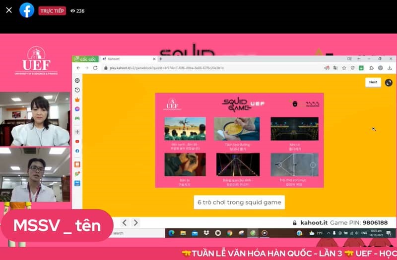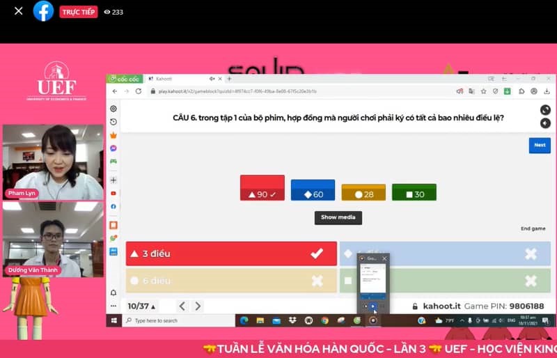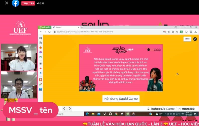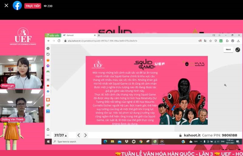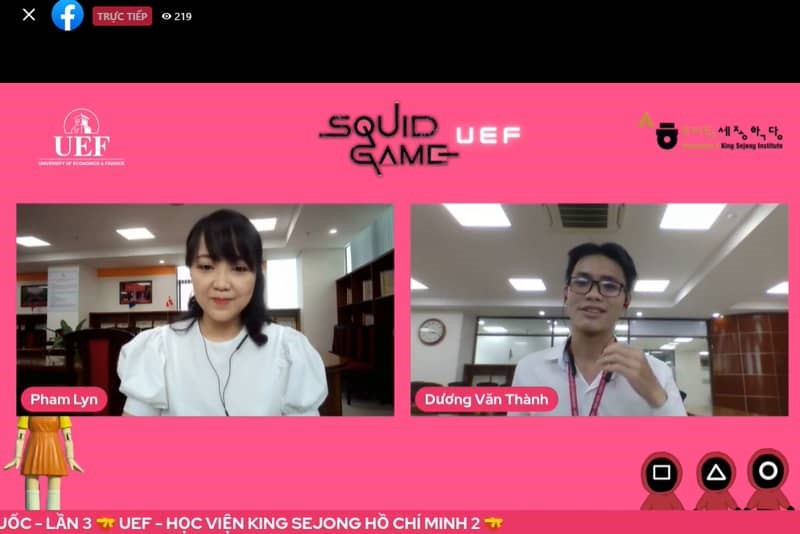 “Squid Game” phiên bản UEF với nhiều điều thú vị Nội dung của “Squid Game” xoay quanh những trò chơi sinh tồn dựa theo những trò chơi quen thuộc của trẻ em Hàn Quốc ngày xưa, diễn ra tại địa điểm bí mật bởi một tổ chức bí ẩn ở Hàn Quốc gồm 456 người tham gia, là những người đang chìm trong nợ nần, gặp khó khăn tài chính. Người chiến thắng các trò chơi của Squid Game sẽ sở hữu phần thưởng đến 45,6 tỷ won. Trò chơi Squid Game phiên bản UEF gồm có 37 câu hỏi xoay quanh nội dung của bộ phim trên, đồng thời lồng ghép văn hóa Hàn Quốc trong câu hỏi để sinh viên tiếp thu được những kiến thức bổ ích và thú vị.