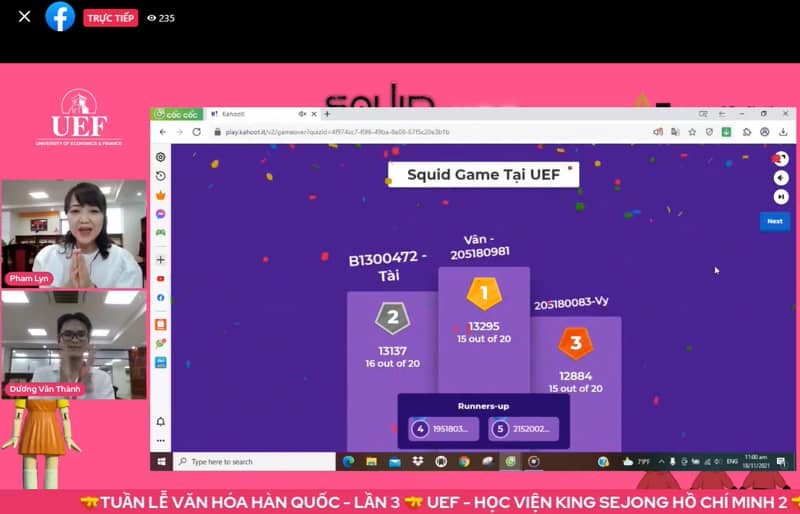 Những câu hỏi xoay quanh bộ phim “Squid Game” lồng ghép văn hóa Hàn Quốc Sau 37 câu hỏi, 3 người giữ vị trí cao nhất gồm bạn Vân - 205180981 với 13295 điểm, bạn Tài – B1300472 đạt top 2 với 13137 điểm và top 3 là bạn Vy – 205180083 với 12884 điểm. Giải thưởng dành cho 3 vị trí cao nhất là gấu bông biểu tượng người quản trò trong phim Squid Game. Những người chơi còn lại trong top 30 đã nhận được phần quà gồm kẹo Dalgona Hàn Quốc và áo King Sejong có dòng chữ của nhóm nhạc nổi tiếng BTS.