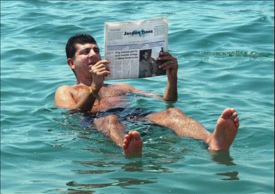 Hàm lượng muối ở biển chết rất cao. Mặc dù mang tên như vậy nhưng nếu chẳng may có bị rơi xuống biển này một lần, thì cho dù có không biết bơi, cũng không bao giờ sợ bị chìm đâu nhé! Điều này cũng là do hàm lượng muối cao, tỷ trọng nước biển còn lớn hơn cả tỷ trọng người bạn, do đó Vì thế ta có thể nổi trên biển như một tấm gỗ. Người ta kể lại rằng, vào khoảng thế kỉ thứ I, người La Mã dẫn tù binh tới Biển Chết để hành quyết. Ở nơi đây, đám tù binh đã bị ném xuống biển, nhưng họ không hề chìm và vẫn nổi trên mặt nước. Điều này khiến cho đám quân lính hoảng sợ và nghĩ rằng đám tù binh được Thượng đế phù hộ nên đã cho phóng thích. Về sau này, người ta mới khám phá ra rằng con người hoàn toàn có thể nổi bồng bềnh trên mặt biển ở nơi đây, xem sách báo và tận hưởng vị biển dưới nắng.