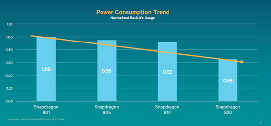 Mức độ tiêu thụ pin của Snapdragon 820 so với các thế hệ chip trước đây.