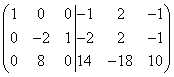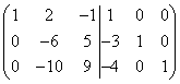 Nhân hàng đầu tiên của ma trận bên trái và bên phải với (-3) và thêm nó vào hàng thứ hai, sau đó nhân hàng đầu tiên với (-4) và cộng nó vào hàng thứ ba, sau đó chúng ta nhận được