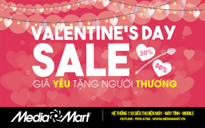 Valentine’s Day Sale 2019 – 3 ngày vàng giảm giá đến 50% Ngày Valentine không chỉ có chocolate, hoa hồng và những bữa ăn tối lãng mạn. Trong số vô vàn những món quà tặng, một món đồ điện máy, công nghệ hay đồ dùng nhà bếp không phải là ý tưởng tồi cho ngày Lễ tình yêu. Cùng tận hưởng chương trình giảm giá đến 50% áp dụng trong 3 ngày vàng từ 13/2-15/2/2019 tại chuỗi siêu thị điện máy MediaMart trên toàn quốc để mua sản phẩm “ Giá yêu thương – Tặng người yêu thương”.