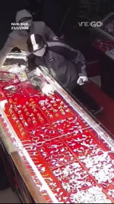Camera an ninh ghi lại cảnh hai người đàn ông mặc áo khoác, đeo găng tay, bịt kín mặt cầm dao xông vào tiệm vàng, dùng búa đập vỡ tủ kính, gom số lượng lớn nữ...