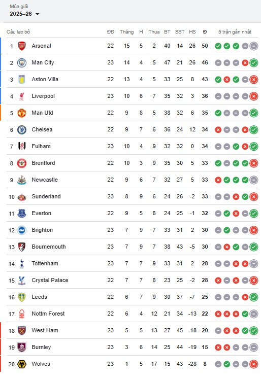 40 phút trước BXH EPL sau loạt trận đêm 24/1: Man City áp sát Arsenal, Liverpool nguy cơ bật bãi...