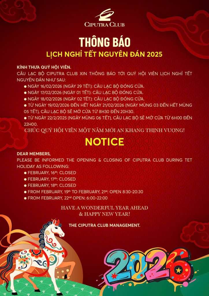 Trước thềm Tết Nguyên Đán 2026, Ciputra Club trân trọng thông báo lịch nghỉ Tết như sau: