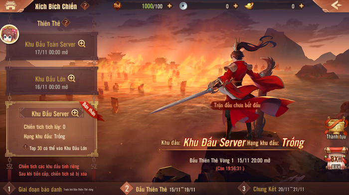 2. Giao đoạn khiêu chiến (Đấu Thiên Thê)• Thời gian: từ 00:00 ngày 15/11 đến 20:25 ngày 19/11• Mỗi ngày sẽ có 2 lượt đánh lúc 20:00 và 20:15• Trong giai đoạn này người chơi vẫn có thể báo danh tham gia.