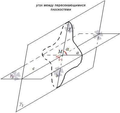Định nghĩa có thể được gửi dưới dạng khác. Tại giao tuyến của hai mặt phẳng γ 1 và γ 2, trong đó c là đường thẳng cắt nhau, lấy điểm M, qua đó kẻ các đường thẳng a, b vuông góc với đường thẳng c và nằm trong hai mặt phẳng γ 1 và γ 2 , khi đó góc giữa hai đường thẳng a và b sẽ là góc giữa hai mặt phẳng. Trong thực tế, điều này được áp dụng để xây dựng một góc giữa các mặt phẳng.