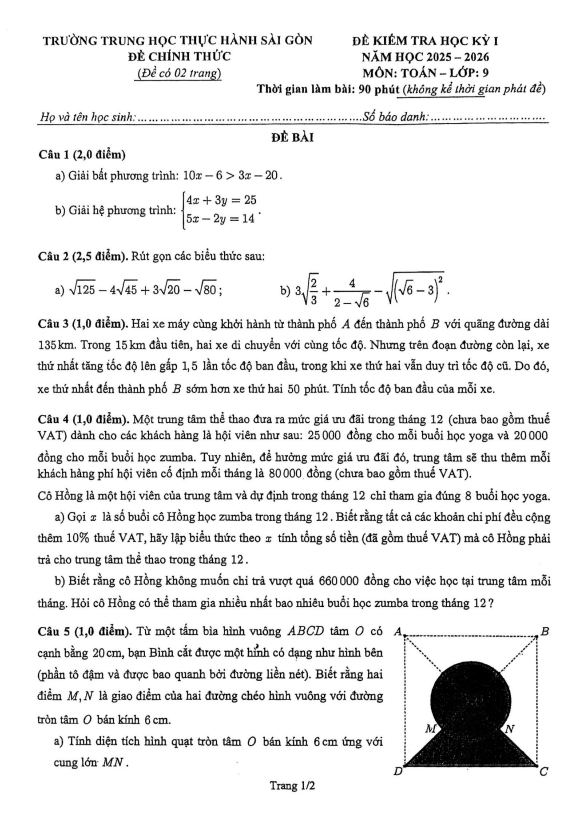 Đề học kỳ 1 Toán 9 năm 2025 – 2026 trường Thực hành Sài Gòn – TP HCM 25/12/2025