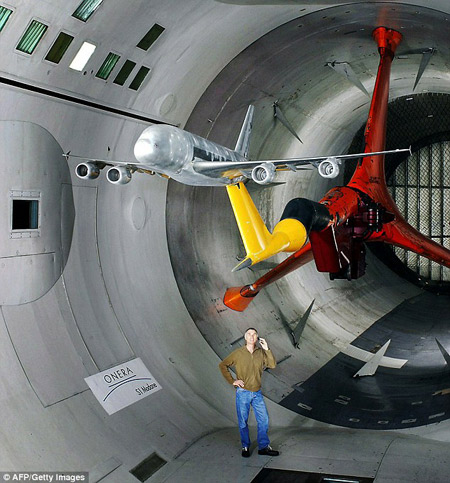 Một mô hình A380 đang được kiểm tra trong hầm gió khổng lồ. Hầm gió khổng lồ này được xây dựng ở vị trí bí mật, nằm ngoài tầm mắt có thể thấy được của con người, nhất là sau khi nó bị phát hiện trong Thế chiến thứ hai. Giám đốc kiểm tra hầm gió tại khu vực Modane, miền Đông Pháp cho hay: “Năm 1945, các mật vụ Pháp đã phát hiện ra một đường ống khổng lồ được xây dựng tại Úc bởi người Đức. Ngay lập tức họ hiểu giá trị và tầm quan trọng của nó, và xây dựng luôn một cái y hệt tại Pháp.” Các hầm khổng lồ này, để có thể hoạt động một cách thuận lợi nhất, chúng thường được xây dựng ở gần các đập nước. Bởi chúng cần một lượng điện cũng khổng lồ không kém để có thể hoạt động. Chỉ một hầm gió tại Modane đã tiêu thụ hết 1.000 công suất điện của nước Pháp.