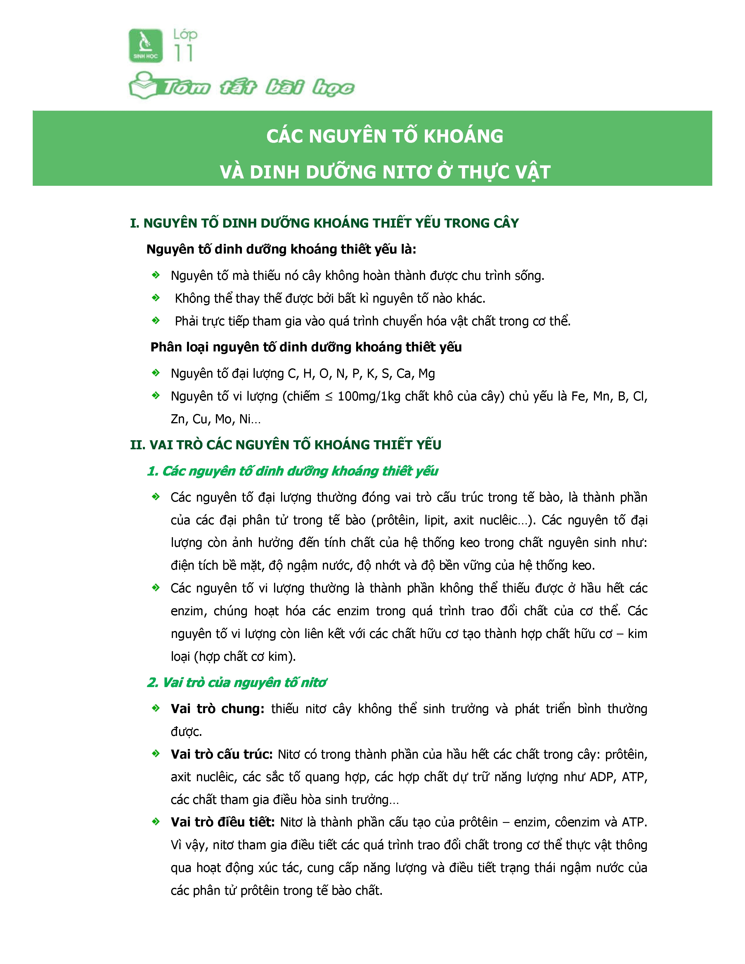 Tóm Tắt Lý Thuyết Sinh Học 11 Bài 1