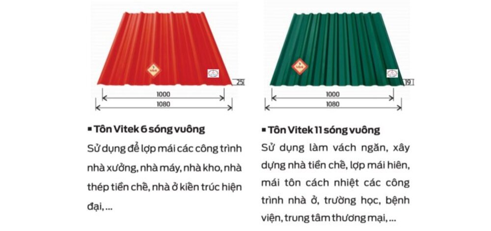 Tôn sóng vuông Vitek được chia ra làm 2 loại sóng là 6 sóng và 11 sóng, phù hợp với nhiều loại công trình từ nhà ở dân dụng đến công xưởng xây dựng như sau:
