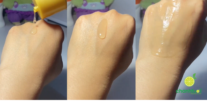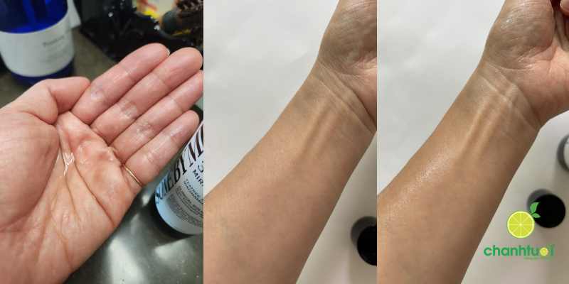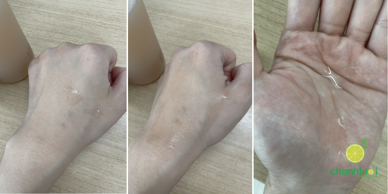Kết cấu lỏng nhẹ, trong suốt, gần như nước. Khi thoa lên da, cảm giác mát tức thì, không châm chích, không nhờn dính. Sản phẩm thấm nhanh, để lại bề mặt da ẩm mịn nhưng không bóng, rất dễ chịu. Mùi gần như không có, phù hợp với người nhạy cảm với hương liệu.