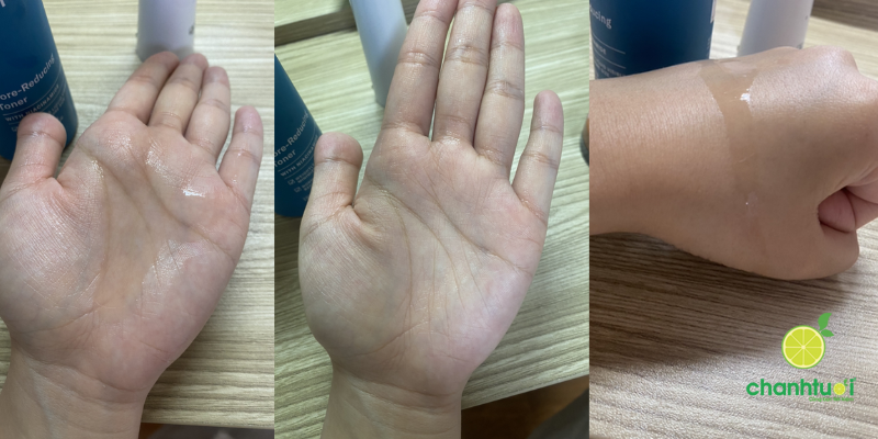 Toner có kết cấu lỏng, trong suốt như nước và thấm rất nhanh. Khi dùng, đặc biệt là với người mới sử dụng hoặc da đang có vết thương hở, sẽ có cảm giác châm chích nhẹ và hơi cay/nóng. Tuy nhiên, cảm giác này giảm dần khi da làm quen.