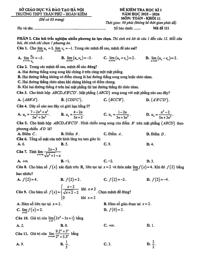 Đề học kì 1 Toán 11 năm 2025 – 2026 trường THPT Trần Phú – Hà Nội 23/12/2025