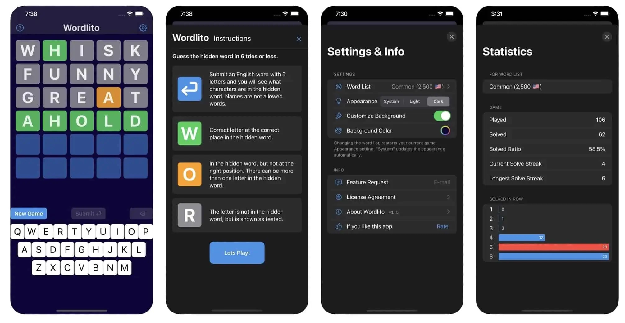 Trò chơi xếp chữ, nơi bạn tìm từ ẩn 5 chữ cái trong 6 lần thử hoặc ít hơn. Bạn được cung cấp các manh mối với màu sắc của các chữ cái được hiển thị. Bạn không bị giới hạn bởi số lượng từ bạn có thể tìm thấy, chơi bao lâu bạn thích.