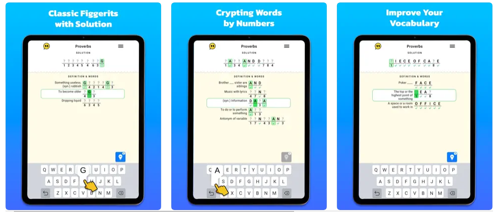 Figgerits không chỉ là một trò chơi giải đố logic và trò chơi thông minh, mà nó còn là một loại trò chơi logic và trò chơi chữ chéo sẽ thổi bay tâm trí của bạn và rèn luyện trí não. Nghe có vẻ thú vị đúng không? Chơi các trò chơi logic IQ, giải các câu đố hóc búa và hoàn thành các cấp độ để giành chiến thắng trong trò chơi. Sử dụng manh mối để giải mã thông điệp và giải mã mật mã.