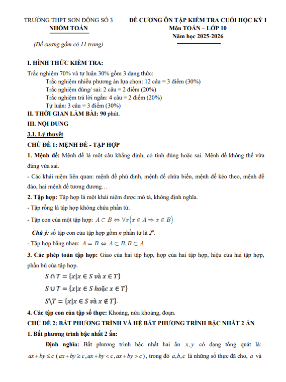 Đề cương cuối học kỳ 1 Toán 10 năm 2025 – 2026 trường THPT Sơn Động 3 – Bắc Ninh 14/12/2025