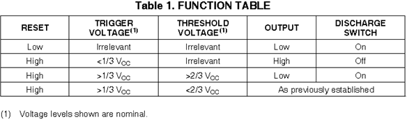 Hình 02 - Sơ đồ khối của IC 555 Nguyên lý hoạt động của IC 555 được mô tả như sau: [1] Điện áp mức ngưỡng (threshold) và điện áp mức kích (trigger) lần lượt là 2/3 và 1/3 so với VCC. Các mức điện áp này có thể bị thay đổi bằng chân điều khiển áp (CONT). Khi điện áp chân TRIG dưới mức kích, mạch flip-flop được set, làm chân ngõ ra (OUT) lên mức cao. Khi điện áp chân TRIG trên mức kích và đồng thời chân ngưỡng (THRES) trên mức ngưỡng, mạch flip-flop bị reset, làm chân ngõ ra (OUT) xuống mức thấp. Ngoài ra, khi chân RESET xuống mức thấp, mạch flip-flop sẽ bị reset, làm chân ngõ ra (OUT) xuống mức thấp. Khi ngõ ra mức thấp, chân DISCH được nối xuống GND. Hình 03 - 04 - 05 trình bày chức năng các chân và một số đặc tính điện của IC 555. Đầy đủ đặc tính xin xem trong datasheet từ nhà sản xuất ở mục tham khảo bên dưới.
