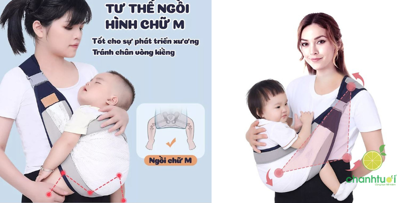 Hỗ trợ phát triển thể chất: Địu đúng cách với tư thế chữ M giúp xương hông của bé phát triển khỏe mạnh, hạn chế nguy cơ loạn sản xương hông.