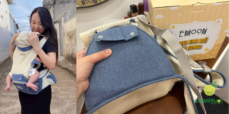 Ngoài ra, dây đai và khóa cài của Emoon được làm rất chắc chắn, phân bổ lực đều hai bên vai và lưng, giúp giảm áp lực cột sống, cổ vai gáy, cũng như hạn chế đau mỏi hông nhờ đai trợ lực rộng 13,5 cm. Từ trải nghiệm tổng thể, mình thấy đây là một chiếc địu hiện đại, tiện lợi và an toàn, đặc biệt phù hợp cho những chuyến đi chơi hoặc khi mẹ cần rảnh tay làm việc nhà mà vẫn giữ bé bên mình.