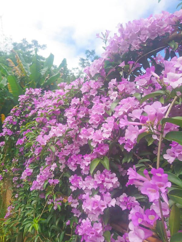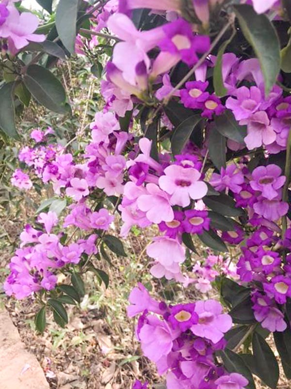 Dây hoa ánh hồng được biết đến với nhiều tên gọi: cây lá tỏi, hoa lý tím, dây ánh hồng, cây lý tỏi… là cây thân leo hóa gỗ, dạng bụi, thân cành mềm mại với hoa có màu tím đầy mộng mơ, rất ứa nắng.