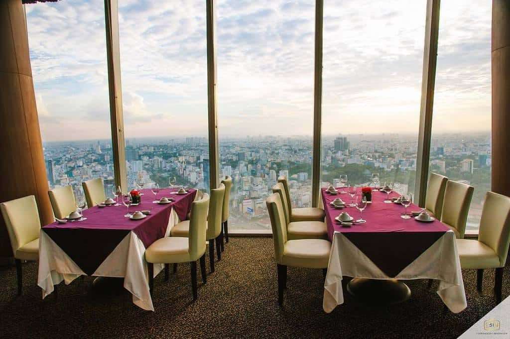 Địa chỉ: 74 Hai Bà Trưng, Quận 1.Điện thoại: (028) 38 272 090.Giờ hoạt động: 11:00 - 23:308. EON 51Nằm tại tầng 51 của toà nhà Bitexco, EON 51 là nhà hàng cao nhất Sài Gòn và có view đẹp nhất nhì thành phố. Khỏi phải nói, khung cảnh ở đây vô cùng lung linh, bao quanh bốn bề là kính. Từ EON 51 con phố đi bộ Nguyễn Huệ và các địa điểm quen thuộc khá bỗng dưng thu bé lại. Bạn sẽ có tầm nhìn toàn cảnh thành phố lộng lẫy khi ăn tối tại EON 51. Đây là một trải nghiệm khá thú vị.
