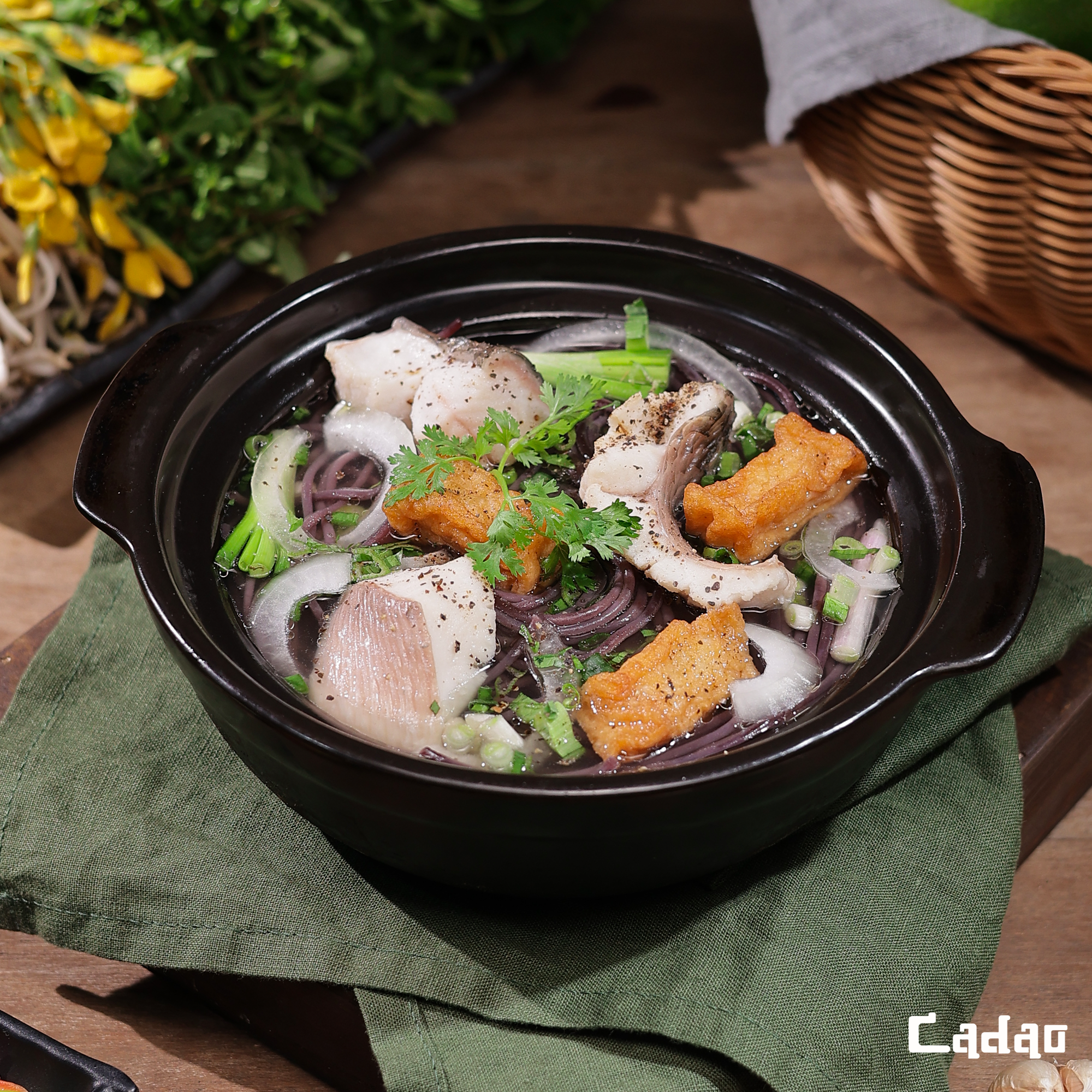 Thực đơn tại Ca Dao phong phú, đậm hương vị Nam Bộ. Đừng bỏ lỡ Bún Huyền Mễ – “ngôi sao” của quán và là nhà hàng đầu tiên giới thiệu món ăn này đến thực khách. Ca Dao sử dụng sợi bún được làm từ gạo lứt đen dẻo thơm, hòa quyện với hương vị nước dùng thanh ngọt, cá tươi, chả cá, cua đồng, hải sản… và các loại rau thanh mát. Bên cạnh đó là các set cơm niêu, cơm phần chuẩn vị miền Tây cùng món kho, canh, xào dân dã và lẩu nóng hổi vào buổi tối. Đặc biệt, Ca Dao còn nhận phục vụ cơm đoàn, cơm tour với thực đơn linh hoạt, phù hợp cho các đoàn khách tham quan.