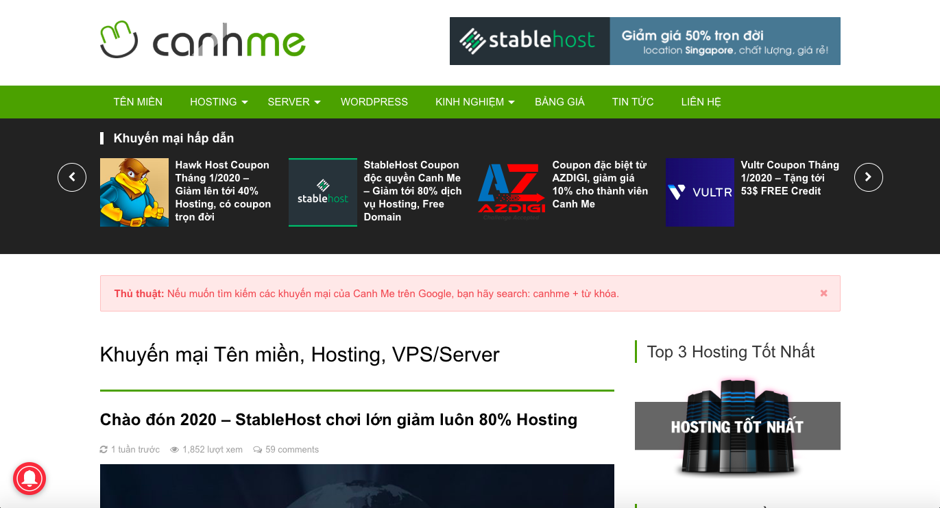 Được đánh giá khá tốt về chất lượng bài viết với tính hữu ích cao cho các lập trình viên, blog canhme.com chia sẻ các kiến thức về làm web, tạo blog trên nền tảng wordpress. Ngoài ra những thông tin cần thiết cho một website hoạt động như đăng ký tên miền, shared host, VPS… đều được hướng dẫn rất rõ cho người dùng.