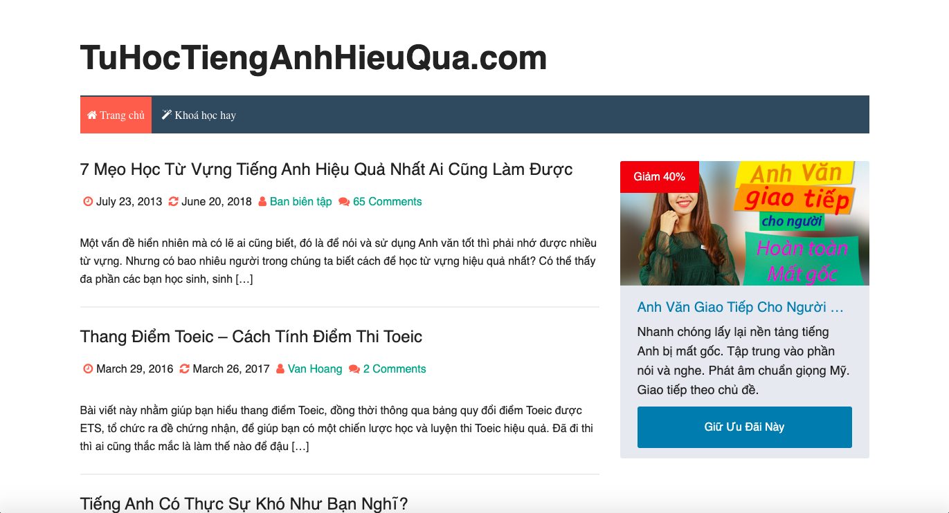 Được xem như 1 blog nổi tiếng hàng đầu về lĩnh vực học tiếng Anh. Blog Tự học tiếng Anh hiệu quả chia sẻ cho độc giả những bài viết tâm huyết, hữu ích cho người dùng nhất để có thể áp dụng vào việc tự học tiếng Anh của mình tốt nhất.