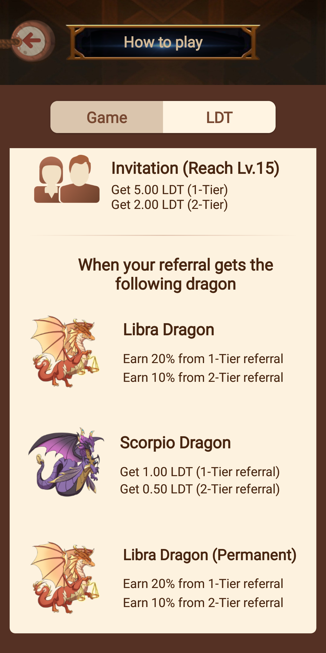 Khi bạn giới thiệu người khác bạn sẽ nhận đươc 5 LDT khi F1 của bạn lên cấp 15, khi F1 của bạn giới thiệu được người và người đấy cũng lên cấp 15 thì bạn cũng sẽ nhận được 2 LDT, ngoài ra bạn còn nhận 20% hoa hồng khi F1 bạn nhận được rồng Libra, 1 LDT khi họ mua rồng Scorpio Dragon.
