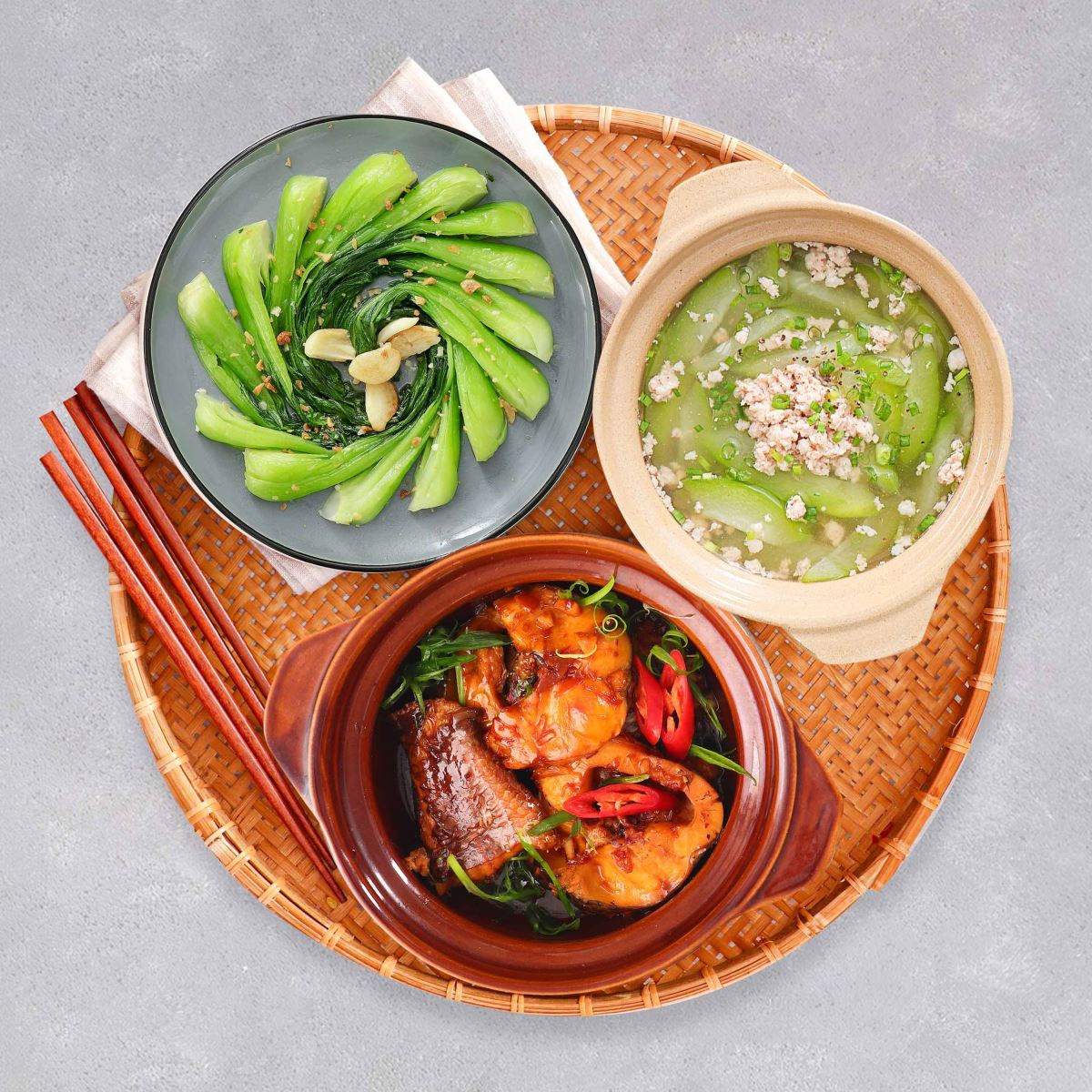 Combo chuẩn cơm mẹ nấu thơm nức mũi với gà ta kho gừng cay nồng ấm nóng, gắp đũa không ngừng với món trứng xào bầu quen thuộc, hương vị beo béo từ trứng xen lẫn với vị ngọt tự nhiên từ những trái bầu tươi xanh. Thêm dinh dưỡng và mát lành cùng canh thịt bằm nấu rau củ.