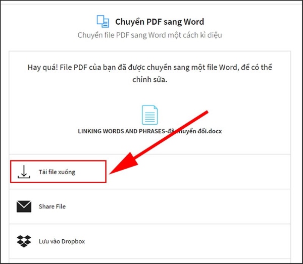 Bước 2: Nhấn chọn vào nút Tải tệp tin để lưu file đã chuyển thành công về máy. Ngoài ra, Bạn cũng có thêm nhiều lựa chọn khác như là tải file trực tiếp qua Dropbox hoặc qua Google Drive.