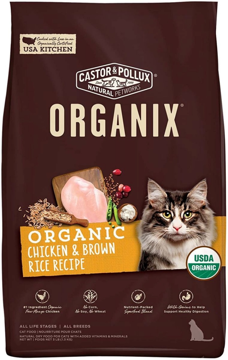 Được làm từ những nguyên liệu hữu cơ, gà thả vườn, protein từ đậu hữu cơ, bột yến mạch và gạo lức. Thức ăn khô cho mèo Castor & Pollux cung cấp một chế độ dinh dưỡng hoàn chỉnh cho mèo với đầy đủ protein, vitamin, khoáng chất, axit béo omega-3 và 6, taurine, men vi sinh. Ngoài ra, thức ăn này còn nhận được chứng nhận hữu cơ từ USDA, không chứa đậu nành, bắp, hóa chất, phân bón, kháng sinh, các loại hóc môn, hương vị nhân tạo, chất tạo màu hay chất bảo quản.