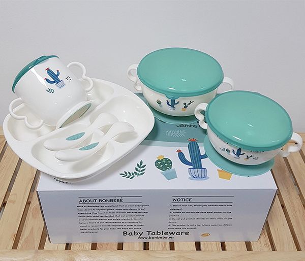 Bạn có thể tham khảo bộ bát ăn dặm 11 chi tiết Bonbébé Bb-03 bao gồm bát, thìa ăn dặm, cốc uống nước bắt mắt, sản xuất theo công nghệ Đức không chứa BPA và các chất gây hại cho bé.