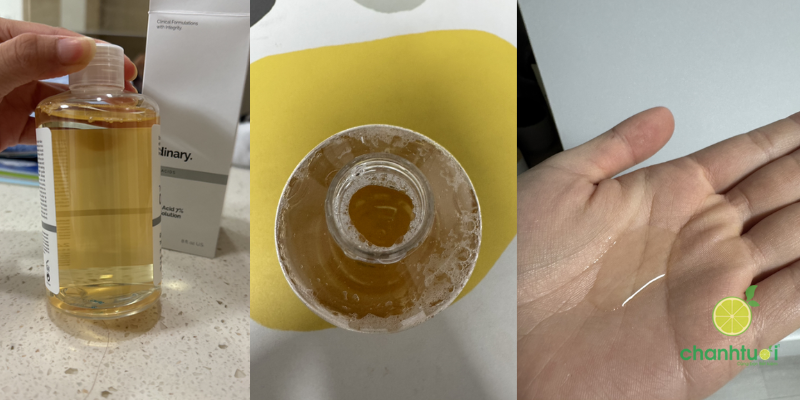 Kết cấu: Dạng nước lỏng, màu vàng nhạt, thẩm thấu nhanh nhưng để lại cảm giác dính nhẹ trên da trong vài phút.