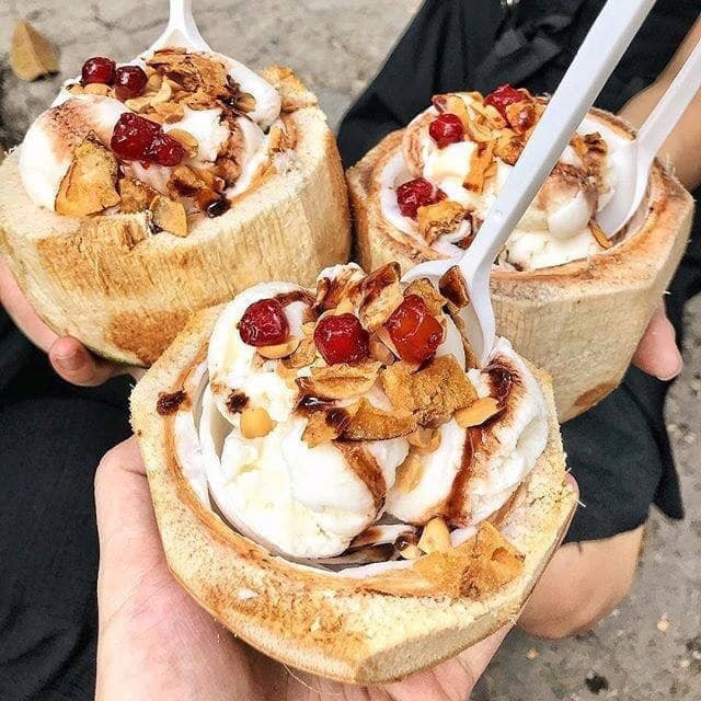 Các xe kem trái dừa gần đây xuất hiện ngày một nhiều tiện lợi cho người dân muốn thưởng thức. Kem dừa được đựng trong quả dừa xiêm cắt đôi, chắt hết nước. Bên trong có kem làm từ dừa tươi, phủ thêm ít sữa đặc, hạnh nhân, đậu phộng, dừa sấy và sốt sô-cô-la hoặc siro. Dù có rất nhiều loại dừa trong món kem này nhưng dừa khô sấy vẫn có hương vị nổi bật và dường như là không thể thiếu. Còn gì tuyệt vời hơn khi cầm trên tay một quả dừa xiêm đầy kem và topping, nhâm nhi dừa khô giòn rụm với hàng tá thứ ngọt lịm tim kia nhỉ.