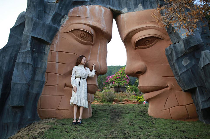 Điều đặc biệt mà du khách không thể bỏ qua khi đến đây đó chính là Hồ Vô Cực - nơi có tiểu cảnh đẹp mắt gồm hai bức tượng khổng lồ ở giữa, hướng mặt vào nhau đang “làm mưa làm gió” cộng đồng mạng những ngày qua.