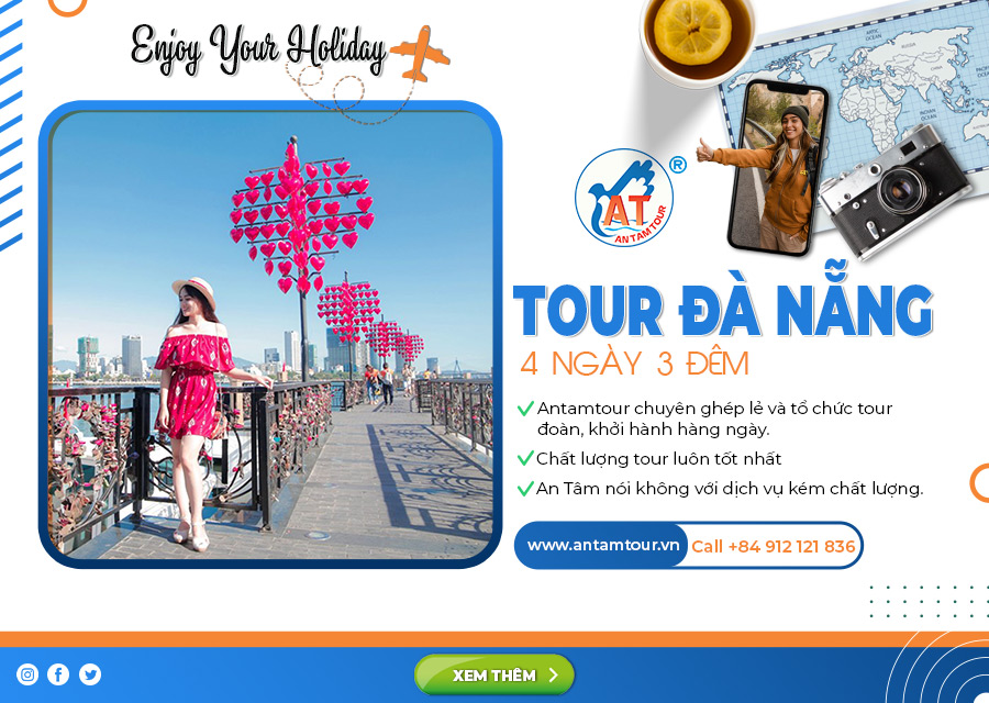 Tour Đà Nẵng là một chương trình du lịch tại thành phố Đáng Sống, tour được tổ chức đường bay từ Hà Nội, mất khoảng 1h15 bay cùng các hãng Vietnam Airline, Bamboo hay Vietjes Air, có thời gian 4 ngày 3 đêm, liên hệ ngay với Antamtour.
