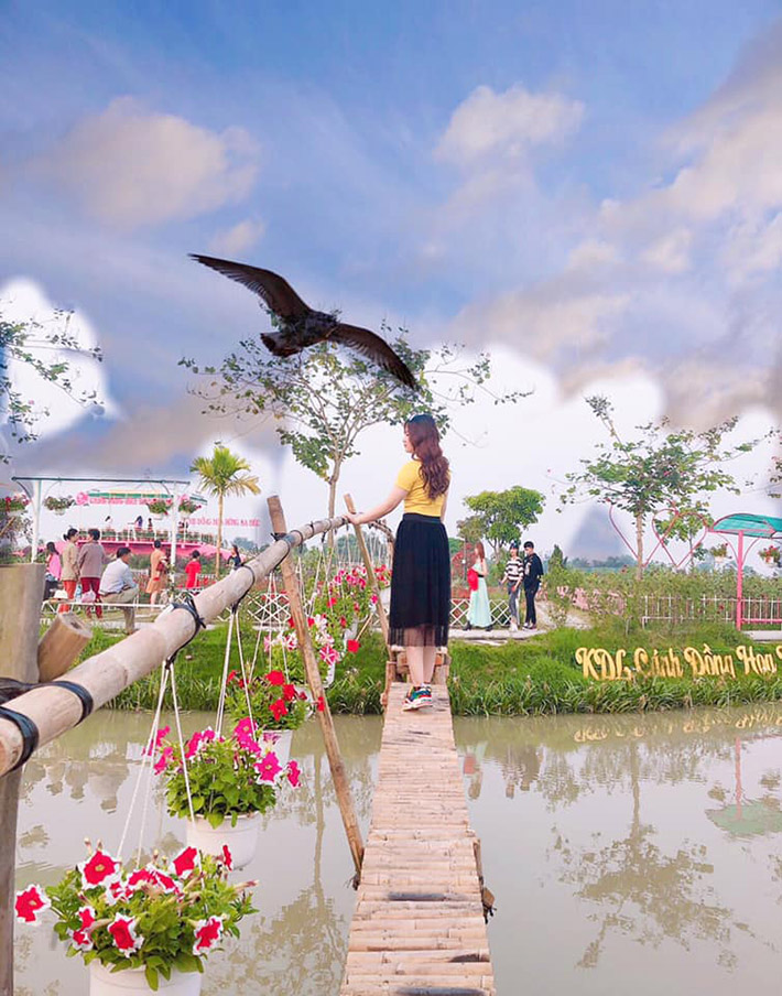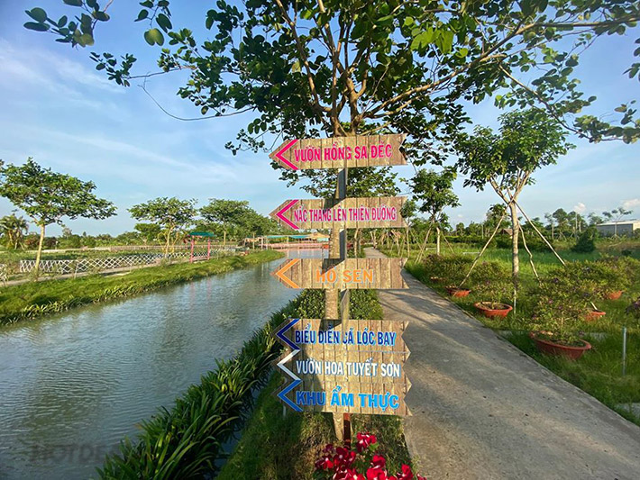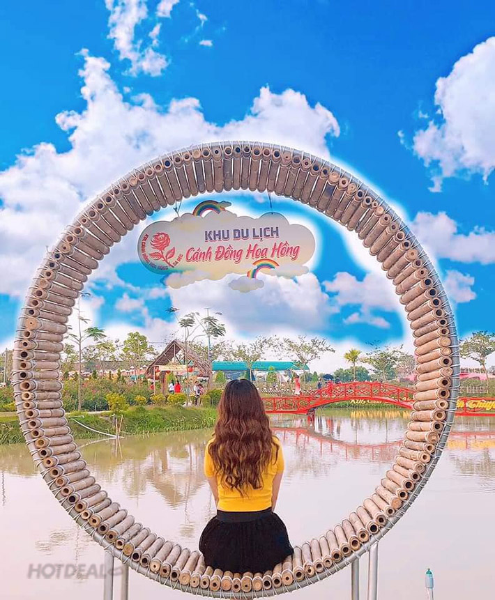 Các tiểu cảnh tại KDL Cánh Đồng Hoa Hồng: thang vô cực, cánh đồng hoa hướng dương, bến thuyền hoa, cầu tre tàng hình, hồ sen, nhà lá, vó bắt cá,...