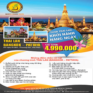 - Tour Thái Lan 5N4Đ: Buffet 86 Tầng - Tòa Nhà Tỷ Phú - Massage Cổ Truyền - Colosum Show do Sài Gòn Beach Travel - một đơn vị du lịch lữ hành uy tín đứng ra tổ chức với nhiều điểm đến mới lạ, hấp dẫn.