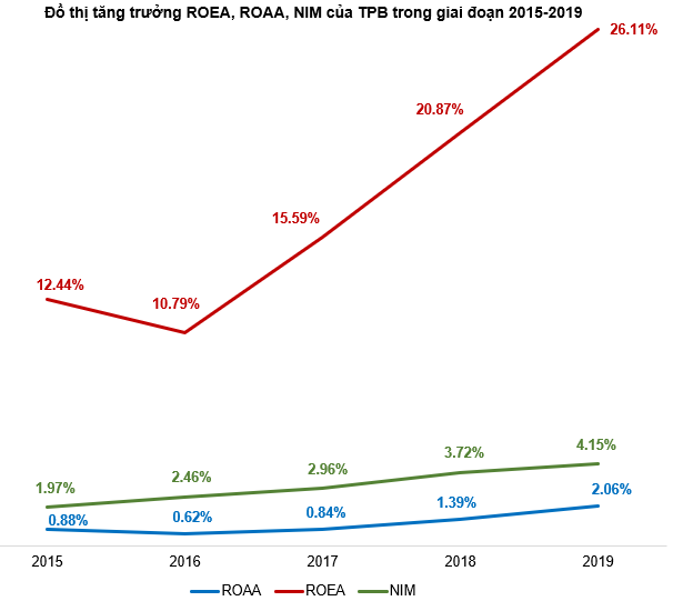 Trong năm 2019, TPB cùng với Ngân hàng TMCP Ngoại thương Việt Nam (HOSE: VCB) và Ngân hàng TMCP Quốc tế Việt Nam (HOSE: VIB) thuộc nhóm các ngân hàng có ROEA cao nhất trên thị trường. Quan sát đồ thị biến động bên dưới có thể dễ dàng nhận thấy ROEA và ROAA của TPB tăng đều trong những năm gần đây. Các chỉ số tăng trưởng ổn định chứng tỏ ngân hàng này đang làm ăn tốt và sử dụng nguồn vốn hiệu quả.