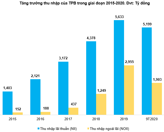 Thu nhập lãi thuần và thu nhập ngoài lãi của TPB tăng trưởng tốt từ năm 2015 cho đến nay. Tăng trưởng của thu nhập ngoài lãi (NOII - Non-Interest Income) gây ấn tượng mạnh khi tăng từ 152 tỷ đồng năm 2015 lên đến 2,955 tỷ đồng năm 2019.
