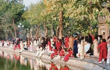 Chen chân chụp ảnh áo dài Tết ở Hồ Gươm Nổi bật